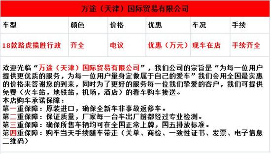 万途(天津)国际贸易有限公司长期经营平行进口路虎品牌高端车型,主流市场营造市场形象,专业渠道打造品质选择。本文就为大家介绍一款性价比超出市场价值的实惠车型——2018款路虎揽胜 (配置|询价)行政创世。从配置与市场以及规格情况为大家在购车时提供一个更加优质的选择。2018款路虎揽胜行政现车在店,手续齐全,自家开票,一手信息,无中间加价行为。