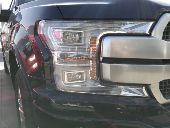全新福特猛禽F150方方正正的前大灯与前保险杠造就了完美的车头造型与比例,进气格栅采用蜂窝状网格设计,并配以雕刻式的福特品牌标识。其前保险杠相当硬朗,且保险杠下方配备金属护板,以应对极端路况环境。整体的车架由高强度钢冲压而成,这样不但提高了车身的耐用性,更对乘客在安全方面有了进一步的保证。