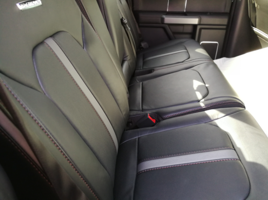 福特猛禽F150内饰采用独特的中控台和门饰板面漆和真皮包裹的方向盘。中控台部分辅以银色饰板装饰,六指针仪表盘的设计有些后工业时代的复古风格。采用带电冷热功能的可记忆式皮革座椅,头枕四向可调,搭配铝饰条和黑色钢琴烤漆内饰。可电动升降的后窗带隔板和电热除霜功能。进口17款福特猛禽F150皮卡真皮座椅包裹性很强,无论是越野还是长途旅行,都很舒服,丝毫不感觉到这大家伙的压抑,二排空间也是十分宽敞,乘坐四个身材高大的乘客绝对没问题。座椅折叠起来可以放一个冰箱,而且门上储物格空间也是够用,虽然不像公羊后排那么豪华,有简易床,但是这种实用的理念 就是福特的宗旨。