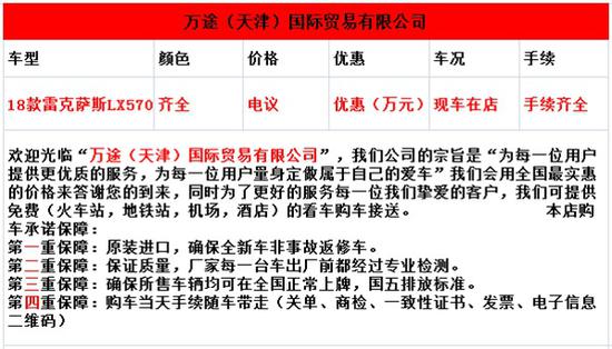 18款雷克萨斯LX (配置|询价)570(凌志LX570)现车到港,走量优惠促销活动,优惠大促销,现车充足,颜色齐全,销售全国,无区域限制,18款雷克萨斯LX570现车在店,手续齐全,自家开票,无中间加价行为,一手信息。响应国家号召现在提车即可享受降税后价格。详情请拨打文章底部电话或添加微信了解。