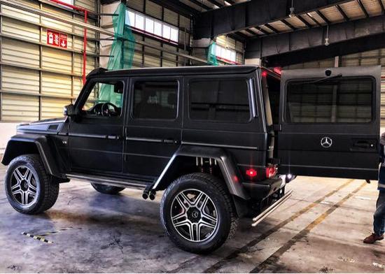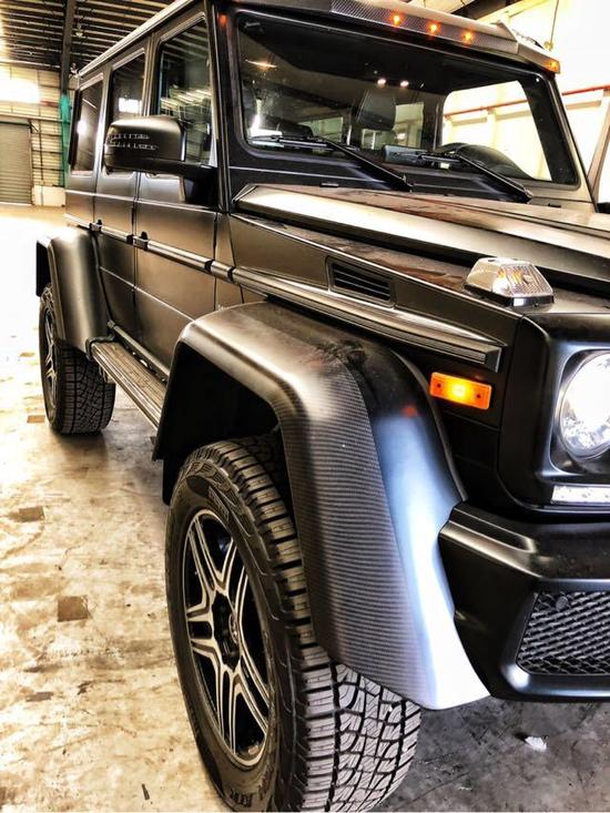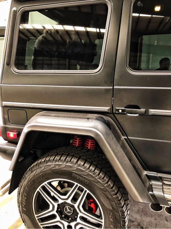 配置:18款美规奔驰G5504x4² 磨砂黑/黑 离地距离 450mm、涉水能力 1米、轮胎间距 1.744mm、3种驱动模式、22寸轮毂、每个轮胎带有两个减震器及两个悬架弹簧