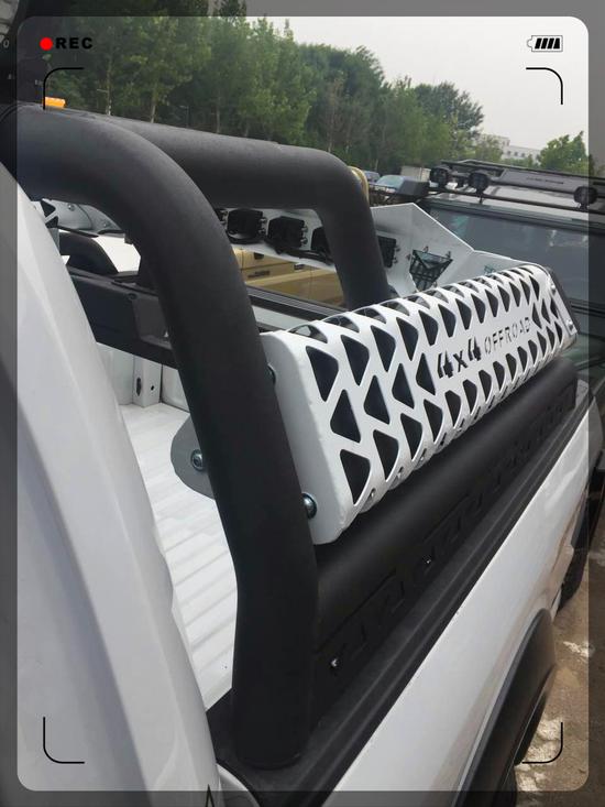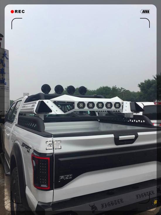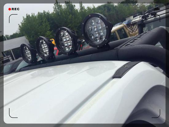重点突出此车的龙门架,双翼飞行模式的黑白配,此车也就是因为多了这款龙门架才显示出它的尊贵。后排五个LED射灯,就算是在漆黑的野外此车后尾也会是明亮照人。