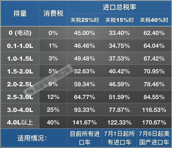 假如上述政策不再发生变动,那么,美国产进口车的关税税率,会在7月1日起从目前的25%下降至15%,随后自7月6日起将从15%上涨至40%。