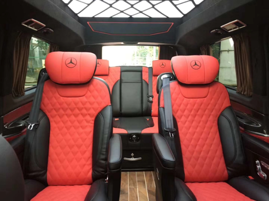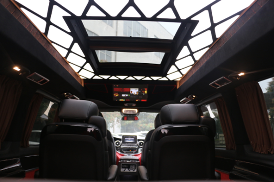 在乘坐性方面,这款奔驰V250改装的版本依旧延续了经典的7座式格局,2驾驶座+2航空座椅+3连电动沙发床的设计,主副驾驶配备后台板以提供旅途中必要的置物小桌的需求;中间属集成了旋转电动、通风加热按摩等8项舒适调节的总裁座椅,后排可倒放平躺的双人床足以缓解旅途疲倦。