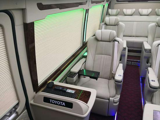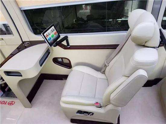 丰田考斯特座椅选装进口埃尔法 (配置|询价)顶配航空座椅,座椅不但舒适而且具有很多实用功能,比如座椅加热、座椅通风、座椅记忆、脚拖(有二级脚拖)、烟灰缸、折叠隐藏式书桌。