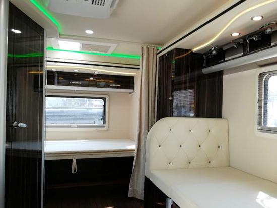 房车上又怎么会少得了床呢?除了客厅的四人卡座衔接的床以外,在C型额头也有一张舒适的双人床。而车身的尾部也搭载着一张隐私性极强的床,顶部的窗帘一拉,私人空间也出来了。
