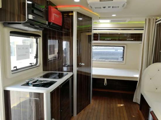 车舱内的设计温馨而优雅,左侧是客厅,右侧便搭配着厨房和独立卫生间了。厨房配备有抽油烟机、电磁炉、洗菜盆,底部还有冰箱可供放置冷藏食物和饮料,有了这些,旅途上不再寂寞了,随时随地烹饪一桌好菜,享受沿路的美景都是轻而易举。