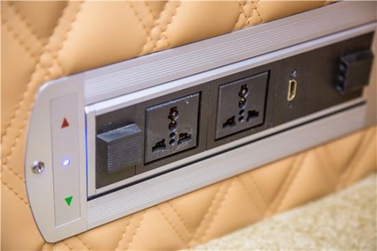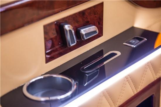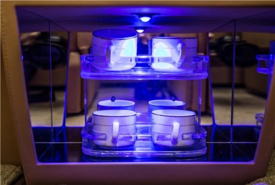 以进口古巴影木雕琢的一体式吧台,集电控中枢、胶囊咖啡机、指纹密码箱、多功能储物装置于一体,40寸影院级视听享受,配合幽蓝色科幻质感的灯光点缀,从这点看,大众T6迈特威的内饰奢华质感,似乎一点不逊色奔驰系列豪车。