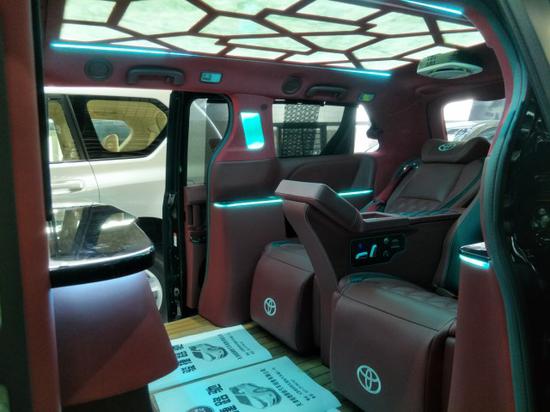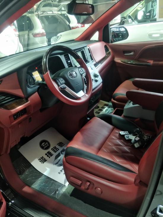 塞纳四驱LE黑色外观,红色内饰,四座,10寸DVD,多功能方向盘,航空座椅(通风,加热,按摩功能)玉石鹿皮星空顶,可升降电视,多功能控制显示屏三区空调,360环影,18寸防爆轮,双侧电动门,后电尾门,游艇木地板,隐私玻璃,后排遮阳帘,空气净化器,主副驾驶电动调节,吧台,音响升级,智能卡一键启动。