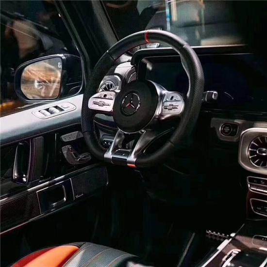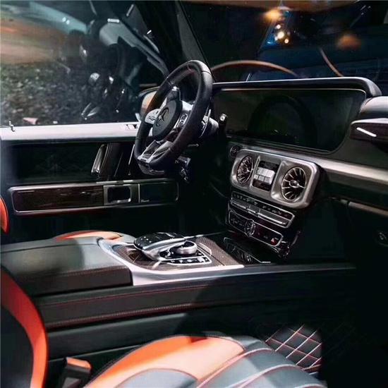 全新奔驰G系依旧注重豪华内饰设计,中控台及整个主副驾驶区域加入大量钢琴漆,金属抛光件,真皮材质的修饰,中控大屏和仪表部分也采用了科技感满满的双12.3寸导航屏,虚拟仪表盘与中控液晶融为一体,视觉上形成一个宽屏驾驶舱,显示界面提供有‘CIassic经典,Sport运动,Progressive进阶’这三种显示模式切换。依然会有用户个性化自定义设定。空调出风口也改为重新设计的炮筒式,方向盘使用了和奔驰S级 (配置|询价)相似能方三幅多功向盘,中控按键被大幅简化,差速锁控制键位于中央空调风口之间,空调出风口采用了家族式扇叶设计,控制中央增加了独立石英表。