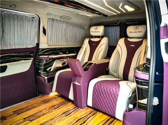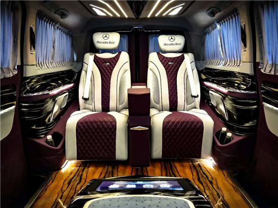 踏入后舱会有一股奢华气息扑面而来,航空座椅,虎斑檀木地板,隔断墙以及32寸液晶电视可升降,豪华吧台以及两个隐藏秘书座椅,娱乐系统等,真真正正的彰显了奔驰商务车的豪华与舒适。