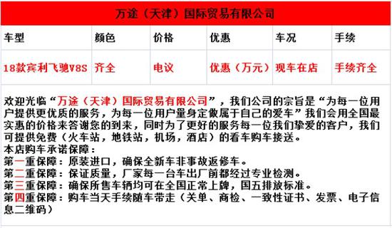 万途(天津)国际贸易有限公司,新到多台2018款宾利飞驰 (配置|询价)4.0TV8S,一手货源,自家开票,2018款宾利飞驰4.0TV8S、现车在店,手续齐全,自家开票,无中间加价行为,一手信息。欢迎广大网友前来选购,买车到万途,踏实又靠谱,本人有多年成功服务客户经验,一定会给您最合理的购车方案,到店够惊喜不断,更送豪华大礼包。