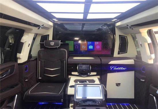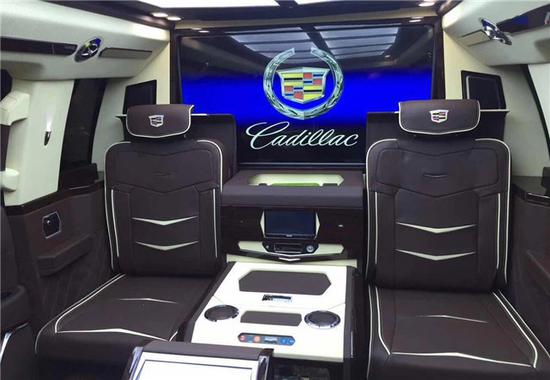 凯迪拉克凯雷德总统一号内部为六座设计,前排为电动折叠座椅,座椅收起跟中间多功能实木吧台融为一体,形成更大吧台。后排为2个独立的电动按摩座椅带8向自动调节功能。乘客舱所有的电器全部集成在后排座椅中间小吧台的屏幕上,操作方便简单。全车都采用酒红色真皮包裹,档次和豪华程度无可比拟。