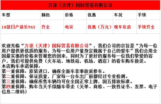 天津万途汽车,新到一批2018款日产途乐Y62 XE SE LE,公司自主海外接车,报关报检,批发零售,分期,售后,为客户提供一站式服务,2018款日产途乐Y62现车在店,手续齐全,自家开票,本家一手信息,无中间加价行为。本公司成立多年,服务过全国各地客户与经销商,对于不同客户,不同地区,均可提供最合适的购车方案。近些日子,受降税风波影响,公司库存,存在滞销状况,现特价优惠促销,日产系列,奔驰SUV系列,丰田系列,本家放毒,秒杀天津港最低成交价。