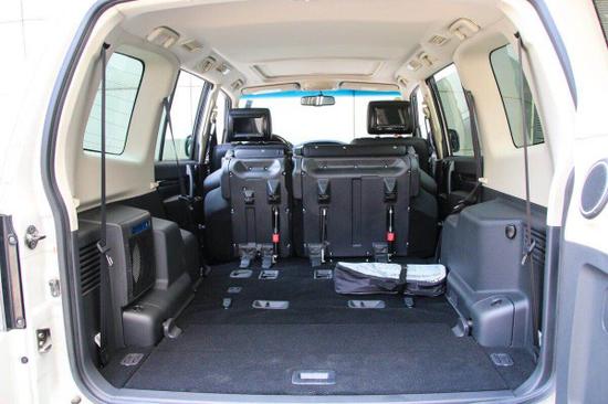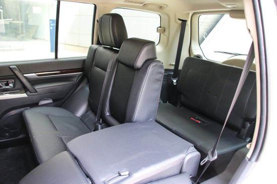 三菱帕杰罗V97还新增了木纹装饰真皮包裹方向盘,集成定速巡航、音响等控制按键,三菱帕杰罗并没有配备自动驻车和陡坡缓降等电子辅助系统,但这款车配备了海拔高度、温度、指南者、气压等专业越野数据显示功能,前排储物空间比较丰富,而最为实用的莫过于中央扶手箱了,它分为上下和冰箱,可以用来分类存放物品,但到了第二排,能称得上是储物空间的也就剩座椅中间扶手处的杯架了,但好在其配备了限位装置,能较好的固定水杯,实用性还不错。