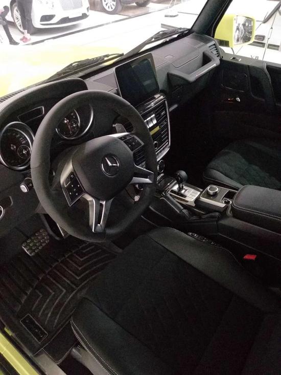 18款奔驰G500 4X4配置:荧光黄/黑内 配置:离地距离 450mm、涉水能力 1米、轮胎间距 1.744mm、3种驱动模式、22寸轮毂、每个轮胎带有两个减震器及两个悬架弹簧 单天窗、22轮、红卡钳、双减震、氙灯LED日行灯、多轮廓电动包裹座椅、翻毛皮内饰(翻毛皮双色座椅、翻毛皮方向盘、翻毛皮门板、翻毛皮内顶)、前排座椅通风加热、二排座椅加热、哈曼音响(14个扬声器)、三把差速锁、中控碳纤维装饰、底盘舒适度调节、脚踏、前电眼、倒影、导航、多功能方向盘(蓝牙、定速巡航、换挡拨片)