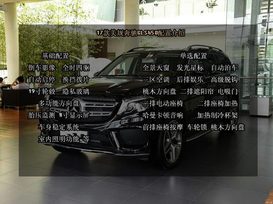 奔驰GLS450美规版现车到店,最新报价优惠,多款配置颜色可选。2018款奔驰GLS450深度解析,GLS450该不该买,奔驰GLS450作为现款GL级的中期改款车型,新车主要针对前大灯组、尾灯组和前后保险杠有所调整,新车前保险杠造型更加夸张。2018款奔驰GLS450仍旧秉持奔驰典雅高贵的气质,同时作为一款SUV越野车,同时,凭借着精致的内饰做工和卓越的驾乘品质一直有着不错的口碑。店内车辆关单、商检齐全 ,当日提车,全国购车皆可办理分期付款,最新的实时价格一手掌握。详情请见下表: