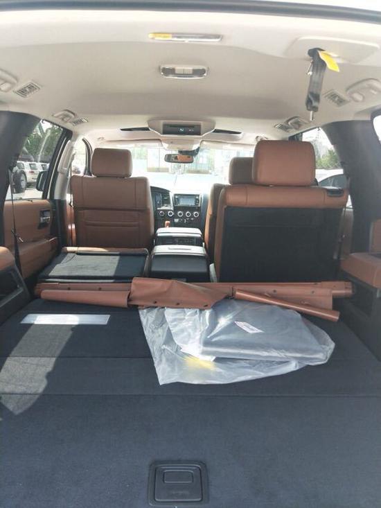 配置方面:5.7L、7座全尺寸SUV、20寸轮毂、雷达测距(ACC自适应巡航)、并道辅助、2/4驱切换、空气悬挂、底盘升降、车身稳定控制、中央差速锁,后桥限滑差速器、吸顶DVD、前座椅通风加热、前座椅电动调节及座椅记忆、第二排座椅加热、主副驾驶腰部支撑、主驾驶腿部支撑、第三排电动座椅、三区自动恒温空调、巡航定速、桃木方向盘、触摸式导航屏、倒车影像、前后电眼、4CD、JBL高保真音响、电动尾门、后排隐私玻璃、全景天窗、脚踏板、行李架、拖钩、皮遮物帘。