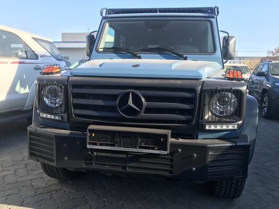 奔驰G350专业版整体造型与民用版G350基本一致,简单经典,线条简洁有力,具有典型的越野车特色。仔细一看也能看出端倪,前后杠采用喷黑工艺技术,材质方面更是选择了钛合金作为主材料。配合喷黑的前中网与轮毂带来的超强视觉冲击使G级显得更加凶悍。