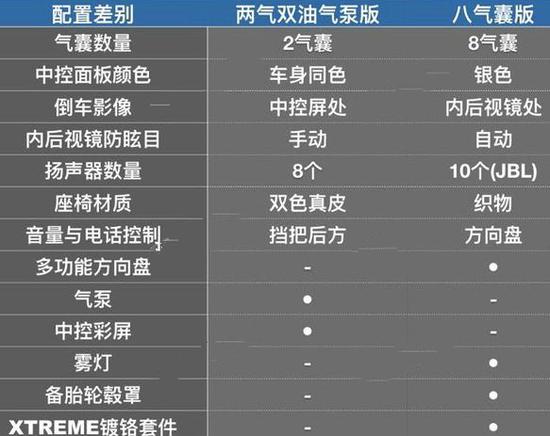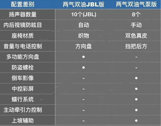 不过,气泵版也比八气囊版少了几项配置,除了比较关键的气囊和JBL十扬声器音响之外,还少了多功能方向盘和后视镜自动防眩目,气泵版只有手动防眩目。