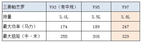 上表为三菱帕杰罗汽油版车型排量和功率扭矩对比表,不含2.8T柴油版的V96和3.2T柴油版的V98,可以看到2018款三菱帕杰罗V97车型已经是三菱帕杰罗汽油版中动力最强的车型了,且中规并没有此车型。