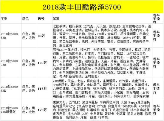 2018款丰田酷路泽5700 VXS限量版参数动力:进口类型:丰田(平行进口) 长*宽*高:5170*1980*1930MM 车身结构:5门7座SUV 油箱容积:138 发动机型号:3UR-FE 排量:5663 进气形式:自然吸气 气缸排列形式:V8 每缸气门数:4 最大马力:397 最大功率:270 最大功率转速:5600 最大扭矩:529 最大扭矩转速:3200 变速箱:8挡手自一体变速箱驱动方式:前置四驱 四驱形式:全时四驱 车体结构:非承载式 轮胎规格:285/60 R18