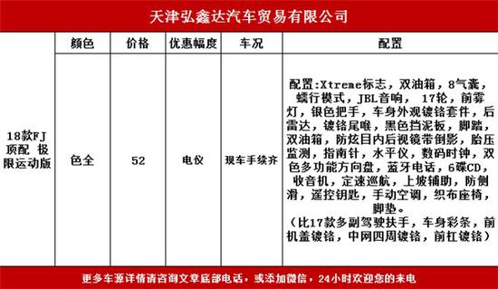 18款丰田FJ酷路泽配置:Xtreme标志,双油箱,8气囊,蠕行模式,JBL音响, 17轮,前雾灯,银色把手,车身外观镀铬套件,后雷达,镀铬尾喉,黑色挡泥板,脚踏,双油箱,防炫目内后视镜带倒影,胎压监测,指南针,水平仪,数码时钟,双色多功能方向盘,蓝牙电话,6碟CD,收音机,定速巡航,上坡辅助,防侧滑,遥控钥匙,手动空调,织布座椅,脚垫。