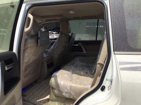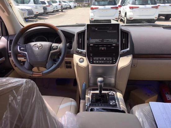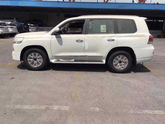 18款酷路泽5700白色EXR版配置:金属漆,蠕行系统 12气囊,无天窗,主驾驶电动座椅,中央差速锁,丝绒座椅,桃木内饰,桃木多功能方向盘,冰箱,智能卡,一键式启动,遥控启动,巡航,CD屏,迎宾灯,后视镜倒影,自动空调,气泵,蓝牙,无电动折叠后视镜,坡道辅助,氙灯LED,285-17轮毂,脚踏,前二后四电眼,拖钩,无行李架,雾灯,双油底挂,灰色亮条中网,胎压监测 。