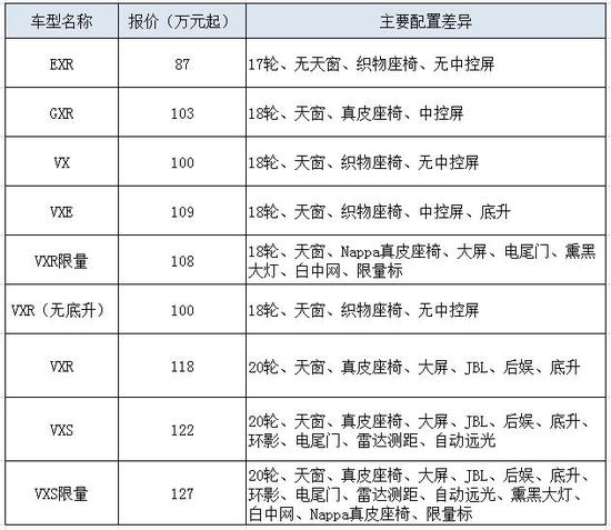 除了这些外观(大灯、中网、尾标)和内饰(配色、座椅样式)不同,其它配置等同普通VXR和VXS。