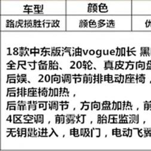 18款路虎揽胜行政版/现车/电吸门;19轮;二代地形;全景天窗;智能卡;脚感电尾;LED日行灯;LED大灯;换挡拨片;定速巡航;多功能方向盘;前座椅加热;液晶仪表;四区空调;冰箱;防炫目后视镜;方向盘加热;钢琴烤漆黑内饰套件+方向盘。18款路虎揽胜运动流畅动感的线条更偏向于时尚运动,车身整备重量将会有所降低,整车的流线设计更加动感,给这款车带来很多浓厚的城市时尚 SUV气息。车顶部尖锐的棱角设计以及狭窄的缝式前后灯组都是新车的外观亮点。