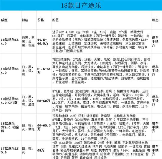 2018款日产途乐4.0 SE 酒红/米 配置:七座 天窗 8寸屏18轮 底挂,2气囊,摇启,日行灯,大灯清洗,自动大灯,大灯高度调节,升级版LED尾灯,智能卡,一键启动,车身同色,电动折叠后视镜。侧踏板,尾翼,前后雷达,电尾门,倒影(双倒影),脱钩,桃木内饰,真皮多功能方向盘,定速巡航,8寸触摸显示屏,,导航,主驾驶8项电动调节(带腰部支撑)智能四驱,陡坡缓降多路况选择LSD,后差速锁。