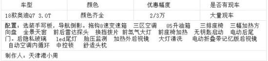 参数方面:奥迪(平行进口) 长*宽*高:5052*1968*1740MM 车身布局:5门7座SUV 最高车速:209KM/H 百公里加快:5.7KM/H 轴距:2994MM 最大载重质量:740KG 油箱容积:85L 行李厢容积:515L 排量:2995ML 进气形式:机械增压气缸摆列形式:V6 最大马力:338PS 最大功率:248KW 最大扭矩:597N.M 变速箱:8挡手自一体主动变速箱。