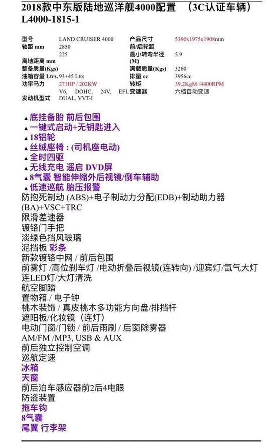 2018款丰田酷路泽4000它外形粗犷有力,在SUV界早已久负盛名,纯直线勾勒出的与自家轿车系列有着明确的区别,到底边时与上格栅的横条辐变成等宽,为酷路泽整个前脸增加了尖锐的效果。。围绕式的尾灯和从新计划的后保险杠,让2018款兰德酷路泽4000中东版的尾部显得再也不粗笨。为酷路泽整个前脸增加了尖锐的效果!新款酷路泽采用过分讨巧的设计来卖弄风情,因为保持经典,升级功能才是王道。
