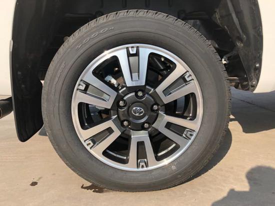 18款丰田坦途20寸轮毂,轮胎与车身中间的距离之大,如同有底盘升降的越野车型,很适合越野。丰田坦途这款车是一款男人味十足的车。试想一下,你如果站在这款车身旁,映衬着后面高大的车身,大气粗犷的线条,将会是怎样一种景象。