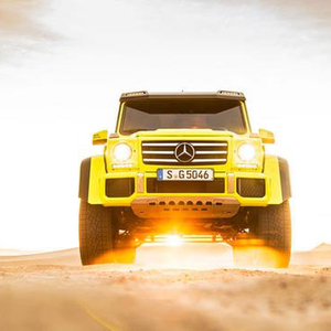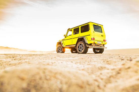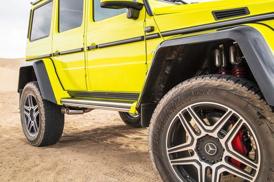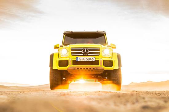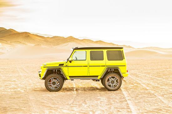 一张图片就已经胜过了千言万语,面对眼前这辆黄色涂装的奔驰G500 4x4的诱惑,相信没有谁能够拒绝吧。即便你是一个对SUV车型甚至对车都没有什么兴趣的人,你也不得不承认这辆车已经让你有“剁手”的冲动了,不过先别着急,因为这货真不是一般人消费的起的,一般土豪都不行。并且产量也是相当“可怜”,有钱也未必能买到,眼前这辆车是美国市场目前仅有的一台。对于奔驰G级 (配置|询价)车型都有些“脸盲”的朋友可能也很难指出它与普通版G级车型的区别,但你们肯定知道三轴的G63 6x6皮卡,而眼前这辆G500 4x4就可以看做是放弃了第三根车轴的6x6,这下你们能想象出这辆车的真正实力了吗?今天我们将会从这款车的一些特别之处进行针对性的介绍,更加方便的阅读理解,了解这款车的精髓。