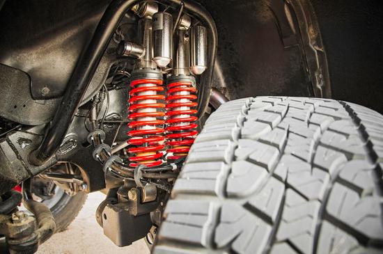 这辆车虽然只有四个车轮,但却用了8个避震和8根弹簧,这一设定不仅与普通版G级车型不同,而且与6x6车型也不相同。奔驰表示,这两根避震中有一根的阻尼是固定的,而另外一根的阻尼是可调的,从而实现运动和舒适模式的切换,而切换时间只需要15毫秒——够快。
