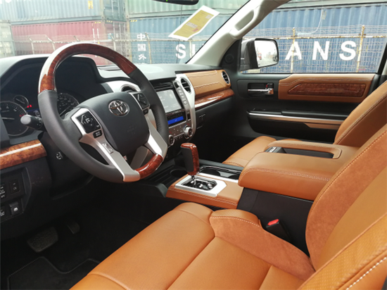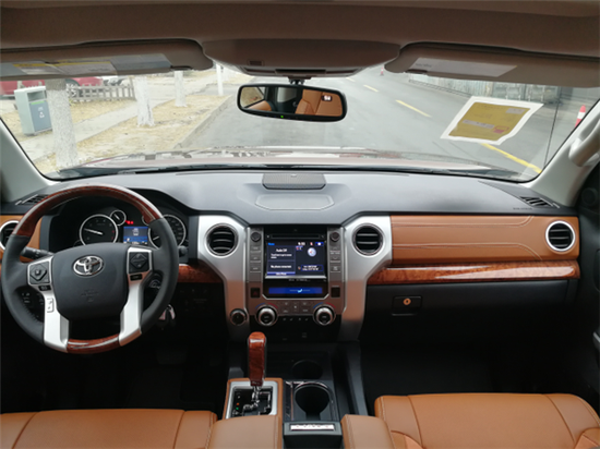 丰田坦途外形设计具有明显的美式风格,宽大的进气格栅几乎占据了整个车头部,与边角略微上扬的车灯组成了近似牛头的图案,镀铬中网、镀铬门把、镀珞外后视镜让这款车更具有超强的金属感,宽阔的肌肉感是豪车的典型风格,两只大灯炯炯有神的新款进口丰田坦途就这样用神态俘虏着车主。