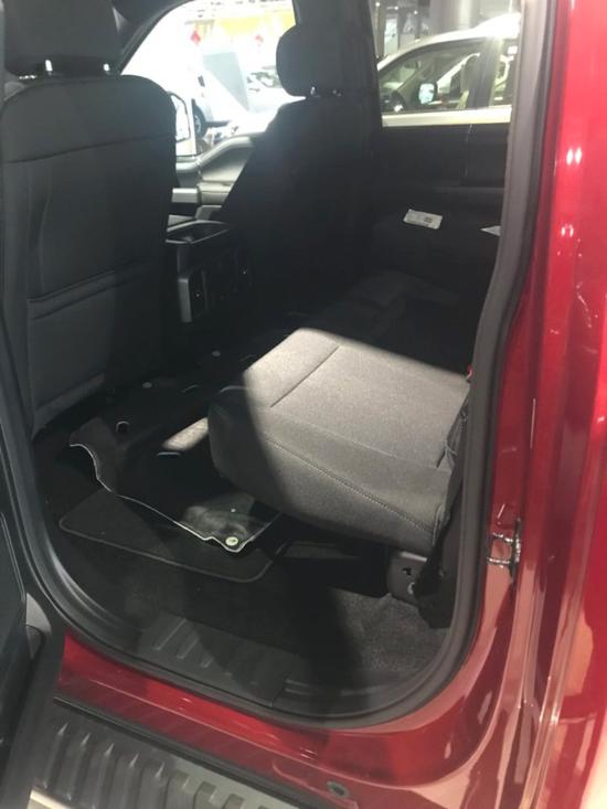 进口18款福特猛禽F150 皮卡真皮座椅包裹性很强,无论是越野还是长途旅行,都很舒服,丝毫不感觉到这大家伙的压抑,二排空间也是十分宽敞,乘坐四个身材高大的乘客绝对没问题。座椅折叠起来可以放一个冰箱,而且门上储物格空间也是够用,虽然不像公羊后排那么豪华,有简易床,但是这种实用的理念就是福特的宗旨。