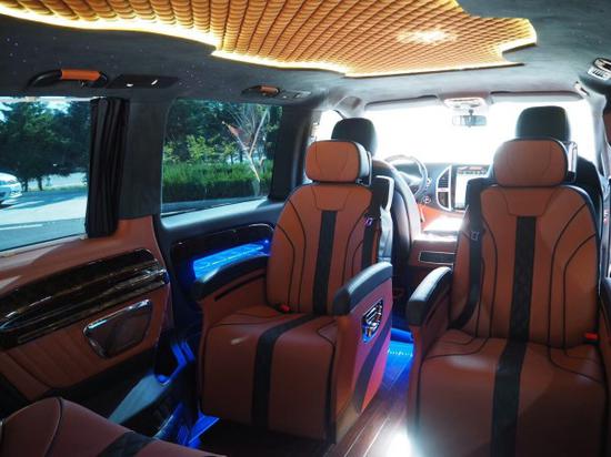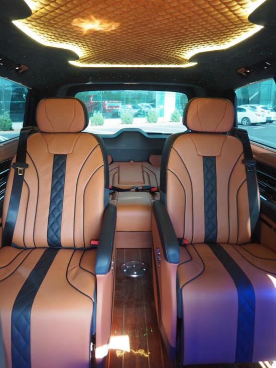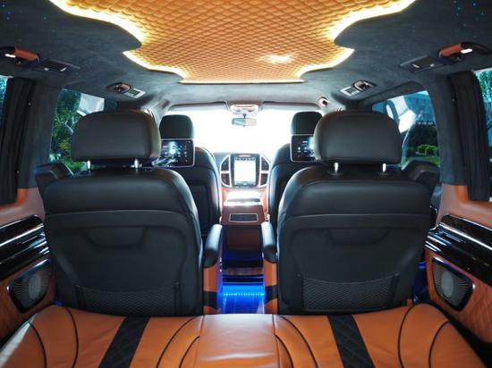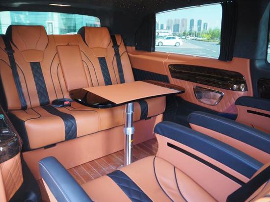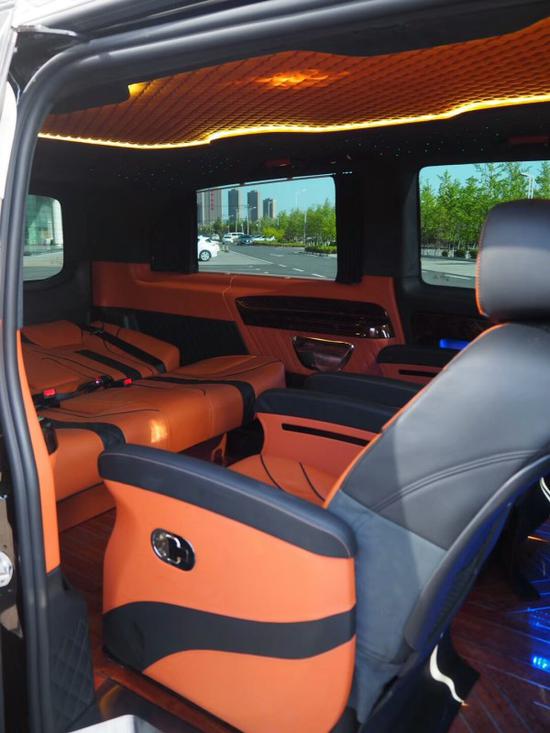 改装细节:大屏导航 电动调节带加热后视镜 高功率空调 盲点辅助 自动启停 带解冻功能后雨刷,改装:咖色迈巴赫风格真皮主副驾座椅,主驾驶背板奔驰专用小桌板,第二排迈巴赫风格电动航空座椅,第三排迈巴赫风格电动沙发床,鹿皮顶,鹿皮的ABCD柱+遮阳板包覆,顶部氛围灯+满天星,车厢柚木地板,四门全包台阶,可拆卸小桌板(第二三排中间),奔驰专用导航,360度环车影像,双头枕DVD,鹰眼大灯,窗边亮条,行李架,桃木方向盘,真皮仪表台。