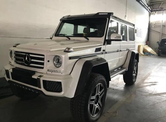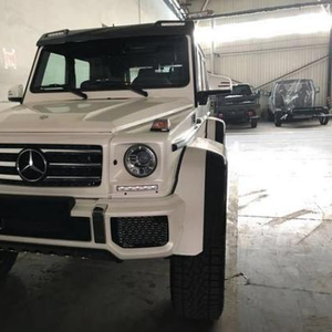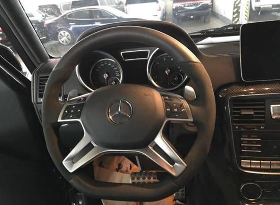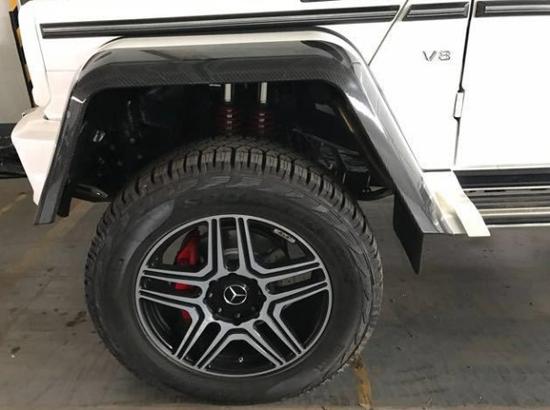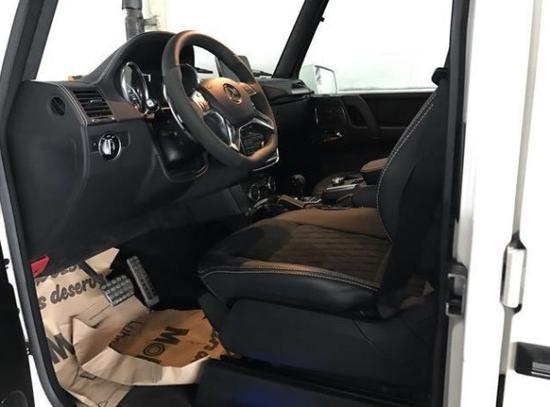 17款墨版G500 4*4 离地距离 450mm、涉水能力 1米、轮胎间距 1.744mm、3种驱动模式、22寸轮毂、碳纤维外观、每个轮胎带有两个减震器及两个悬架弹簧单天窗、22轮、红卡钳、双减震、氙灯LED日行灯、多轮廓电动包裹座椅、翻毛皮内饰(翻毛皮双色座椅、翻毛皮方向盘、翻毛皮门板、翻毛皮内顶)、前排座椅通风加热、二排座椅加热、哈曼音响(14个扬声器)、三把差速锁、中控碳纤维装饰、底盘舒适度调节、脚踏、前电眼、倒影、导航、多功能方向盘(蓝牙、换挡拨片)