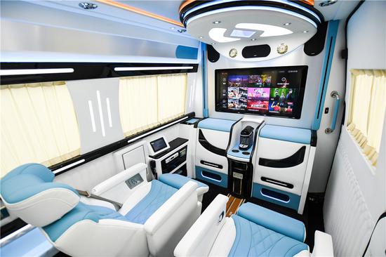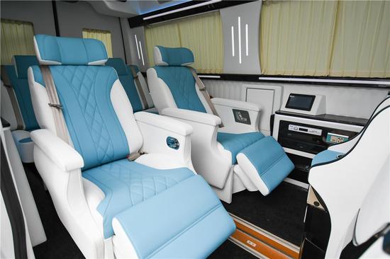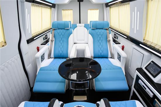 整车纯手工皮质包覆, 整车高光泽钢琴漆装饰面板, 整车降噪隔热处理,高触感电动窗帘(中滑门、尾门手动)。