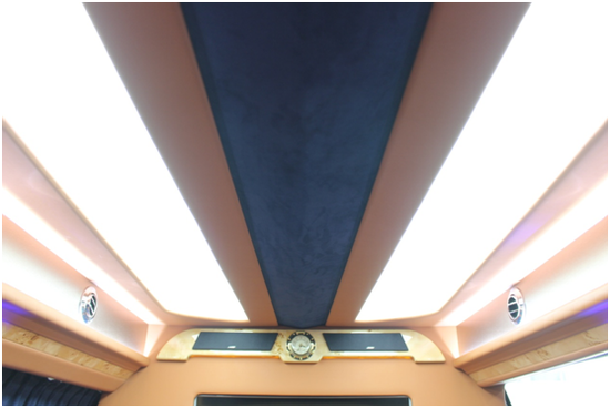 整车采用高档电动窗帘(意大利面料alcantara欧缔兰),顶棚:中部蓝色意大利面料alcantara欧缔兰 +满天星+两侧淡黄色超纤包覆+黄色灯带,顶棚超纤打孔。alcantara欧缔兰是多款世界级名车(兰博基尼 蝙蝠 SV、卡宴 (配置|询价)GTS、玛莎拉蒂 GT MC Stradale)的选择。