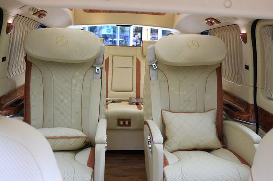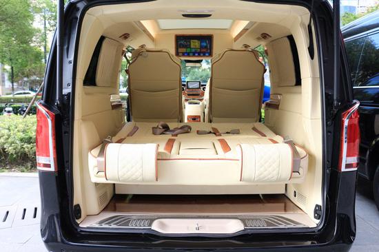后排三座奔驰V260采用双人连坐的电动沙发椅,支持电动一键平躺成床,这样在旅途或者出差中,是坐是躺都可以人为随心操控,给车内乘客带来最大的自由度。