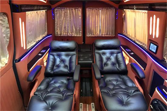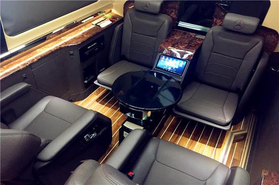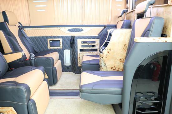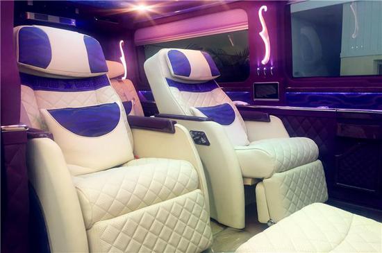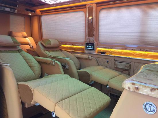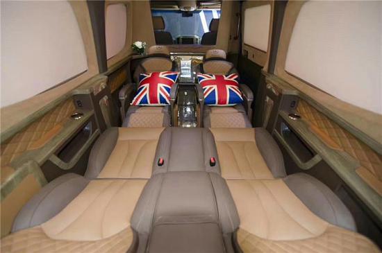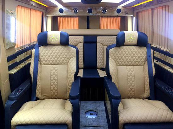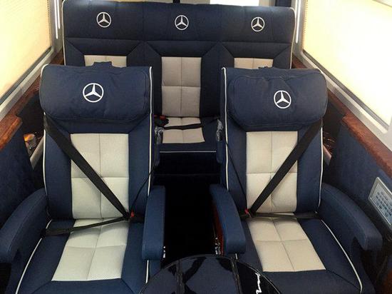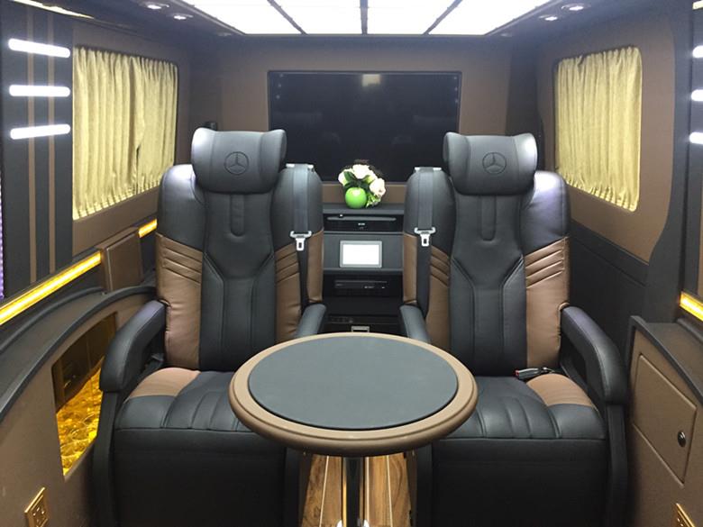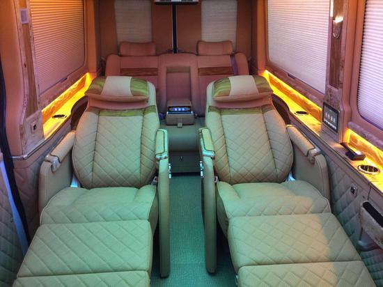 新款奔驰斯宾特车内犹如一间别墅。真皮实座椅软硬适中,二排头等舱可享受真皮座椅通风加热,多档按摩,三排四排可折叠打开变成一张双人大床,车舱玻璃均采用防紫外线隔热玻璃,夏天即便不开空调,也不会感到燥热