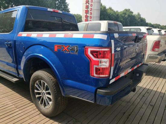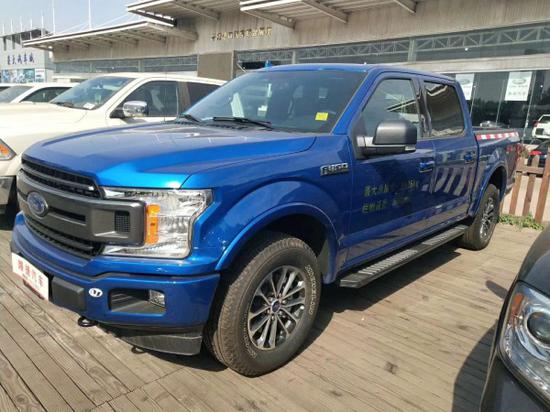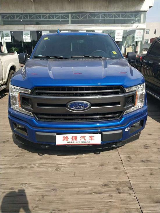 新款福特F-150外观上依旧硬朗,前进气格栅熏黑式设计,中网部分镶入“FORD”标识。上下分体式大灯设计,设入日间行车灯。车身侧面线条笔直,配黑色轮眉、侧踏板、越野花纹轮胎等,双边双出排气布局。
