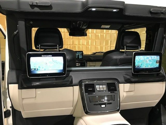 除了外形设计上继承了迈巴赫车型独到的设计元素以外,这台迈巴赫G 650 Landaulet内饰设计也足显其奢华的一面。整个内饰采用米黑两种配色,中控台、门板、方向盘及座椅大量采用真皮材质包裹,奢华感自然不用说。当然,作为“迈巴赫”家族的一员,G 650 Landaulet最大的亮点在于第二排座椅的布局配置。轴距加长意味着设计师多了更多的创意发挥空间,这款新车后排采用两个独立式座椅,并用菱形纹路的皮质包裹,中央则由下部中控台相隔。同时第二排上方的车顶也可以完全打开,使乘客可以肆意享受阳光浴。