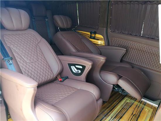 整车座椅采用进口Nappa真皮包裹,电动调节总能让您找到舒适的坐姿,大尺寸触摸屏,配有倒影、后雷达;更有大容量冰箱,安全性,便利性都有保障; 2+2+3座椅排列,也是当前商务车最为流行的设计,二排独立航空座椅,打孔真皮处理更透气,座椅通风、按摩给予您更舒适的乘坐感受,更有360度旋转功能; 无论是照顾孩子、陪家人聊天,亦或是商务洽谈,都能让您随心所欲;此外第三排座椅展开,即可形成一张宽大舒适的沙发床!