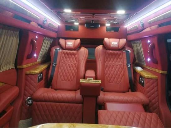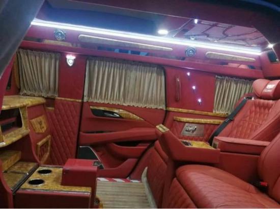 2018款凯迪拉克总统一号整车内部采用4+2布局,驾驶室后采用电视升降隔屏,使得后舱成为一个独立私密的空间,吧台处加装了2个向后翻折的临时座椅,中间还有一键式电动升降桌板,增加了后仓的娱乐功能。