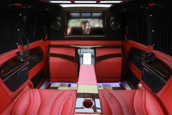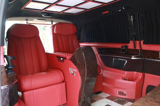 乘客区整车采用宾利原厂真皮包覆,两个独立航空总裁座椅,带腿拖和脚托,有8项电动调节功能,座椅宽厚,可正坐,可平躺,其舒适性、空间性和豪华感远远超越丰田埃尔法。