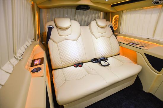 全车内饰包覆,在奢华级LED氛围灯的掩映下,呈现出让人心醉的视觉效果。车顶四周的镀铬出风口配合着前后舱空调独立控制系统,采用全新优化的风道设计,送风更柔和,噪音更低。后舱触摸屏控制系统可以自主控制贵宾舱的电器,灯光,以及生活设施,轻轻动动手指就可以完全掌控。整车纯手工皮质包覆,同时搭配整车酒红色白杨木装饰面板。全车铺设豪华柚木地板,精致美观。